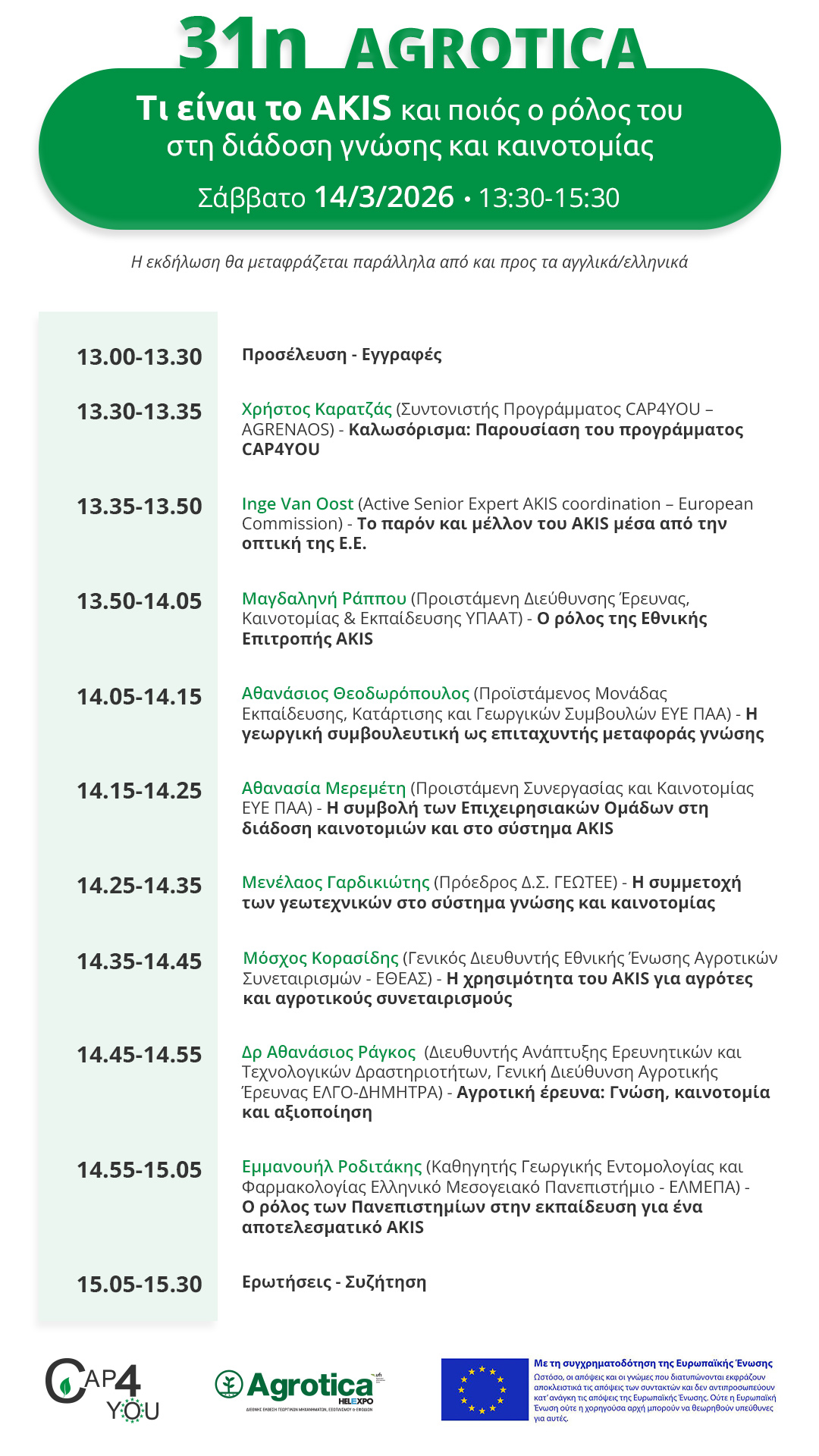 Στο πλαίσιο της AGROTICA 2026 διοργανώνεται εκδήλωση για το «Τι είναι το AKIS και ο ρόλος του στη διάδοση γνώσης και καινοτομίας» το Σάββατο 14 Μαρτίου 2026, στις 13.30, θα πραγματοποιηθεί στην Αίθουσα C του Συνεδριακού Κέντρου «Νικόλαος Γερμανός».